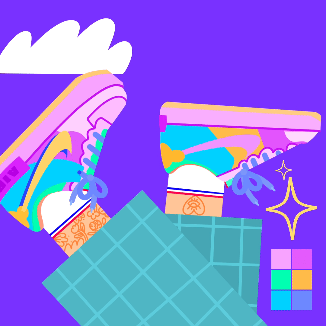 Colorful illustrated sneakers inside a shopping bag with a purple background and sparkling accents.
