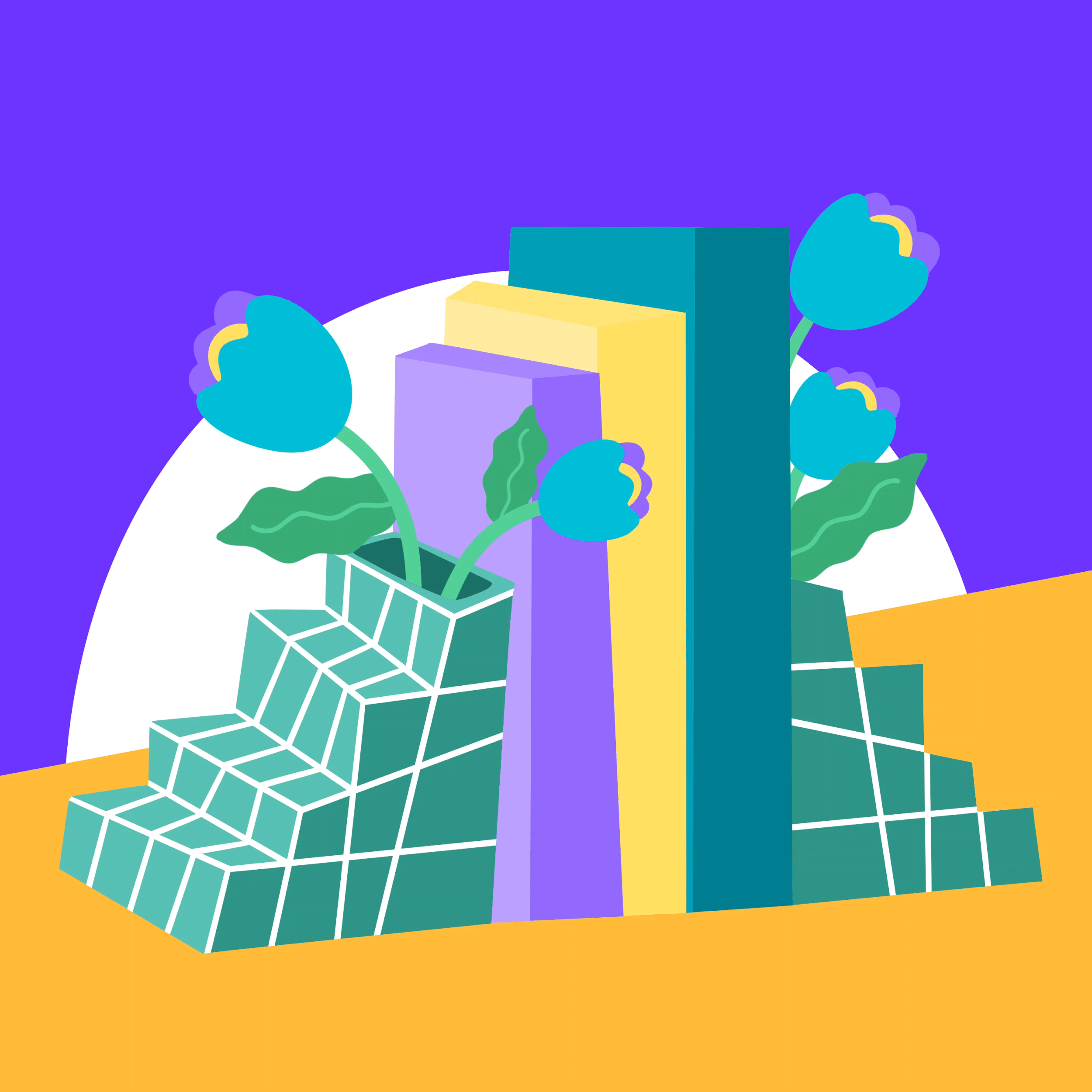 Funky still life digital illustration of books and tulip flowers in a geometric book end vase with bright colors.