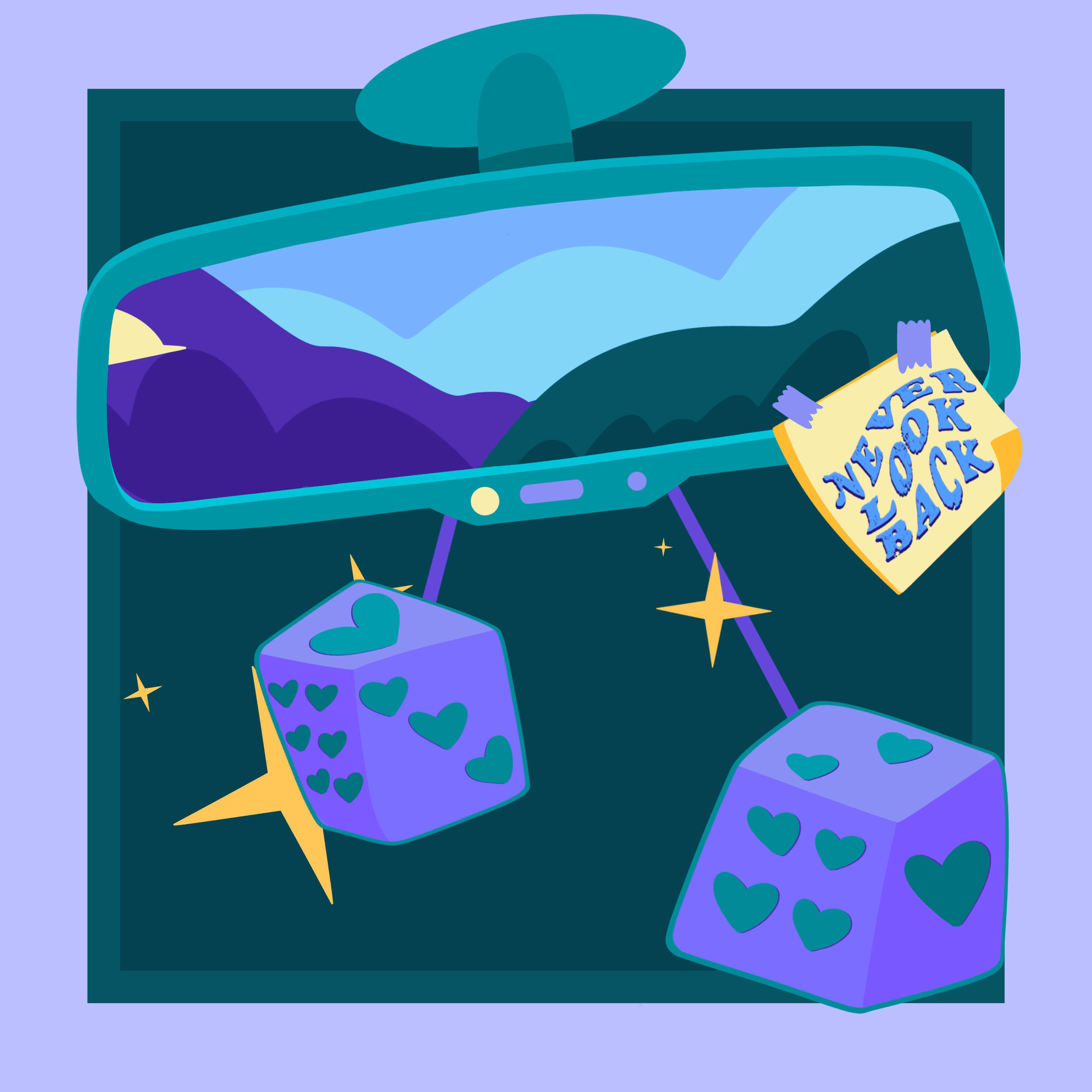 Stylized digital illustration of a rearview mirror reflecting a mountainous landscape with a blue sky and mountains in shades of purple and blue. Hanging from the mirror are a yellow tag with the words 'Never Look Back' and two purple dice with blue hearts and yellow sparkles around them.