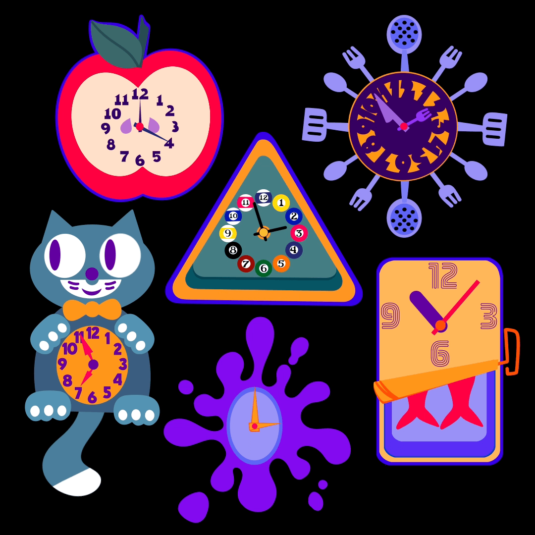 Collection of colorful clocks with creative designs, including a cat-shaped clock, a triangle clock, an apple clock, and more!