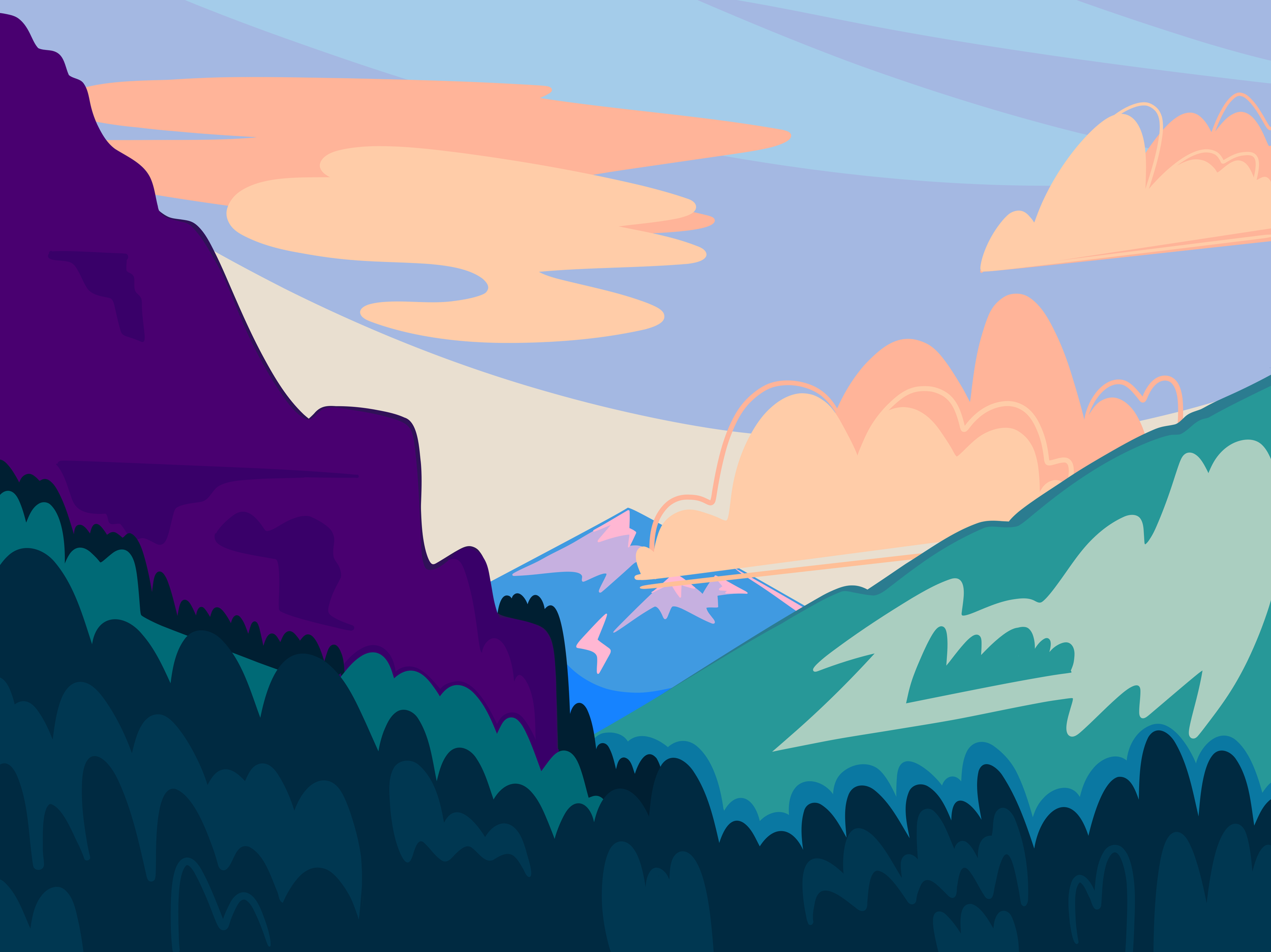 Stylized digital illustration of a mountain landscape with purple, blue, and green mountains, and pink and peach clouds in the sky.