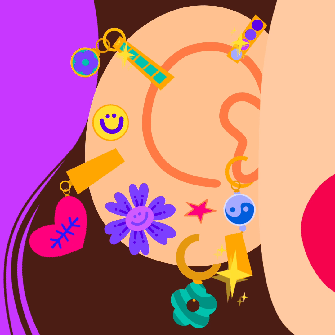 Close-up of a person’s ear adorned with colorful earrings and charms, including a pink heart, a purple flower, a yellow smiley face, a blue yin-yang, and a yellow star, with purple hair and a pink, purple, and brown background.