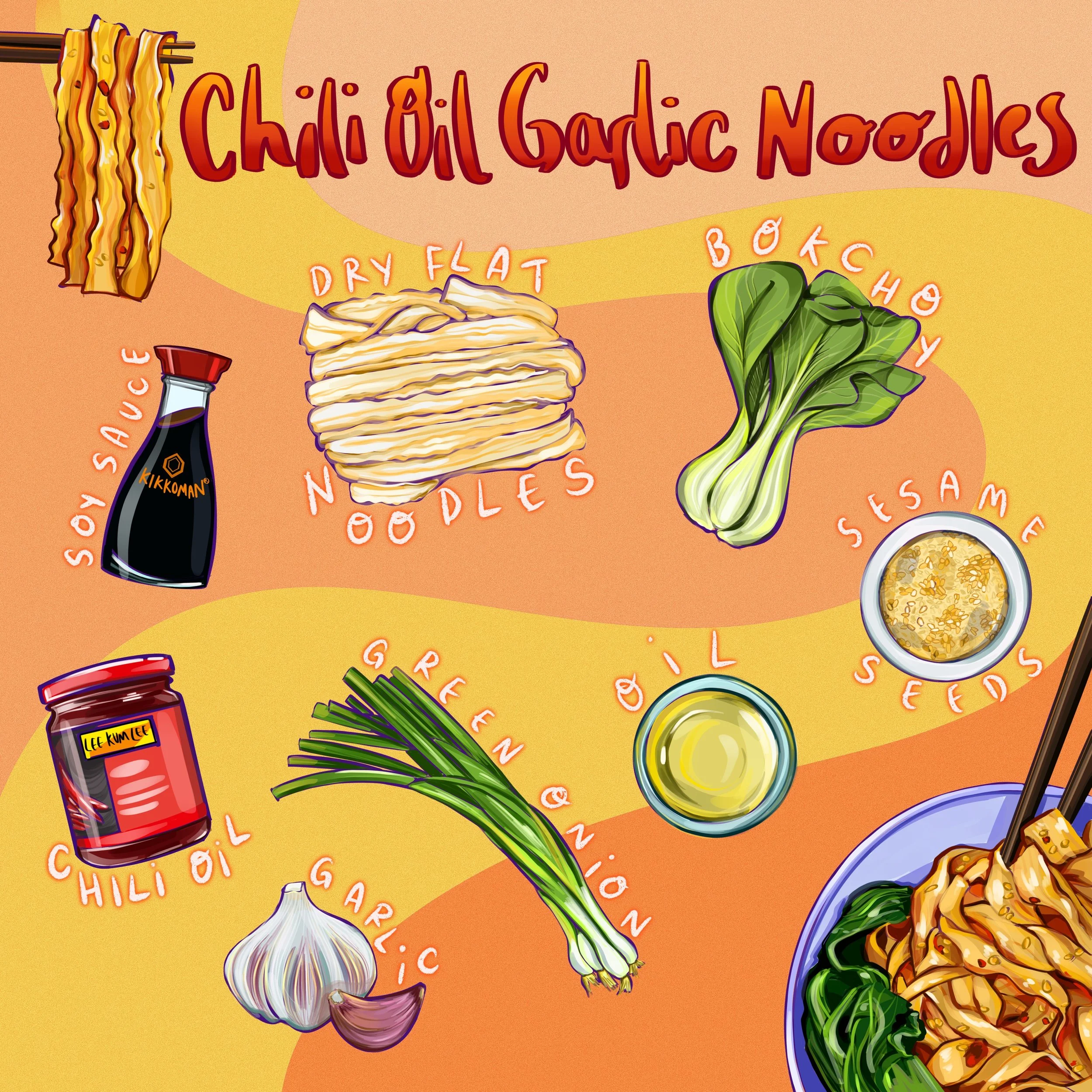 Illustration of ingredients for chili oil garlic noodles, including dried flat noodles, soy sauce, bok choy, sesame seeds, chili oil, green onion, garlic, and oil, with a dish of noodles in the bottom right corner.