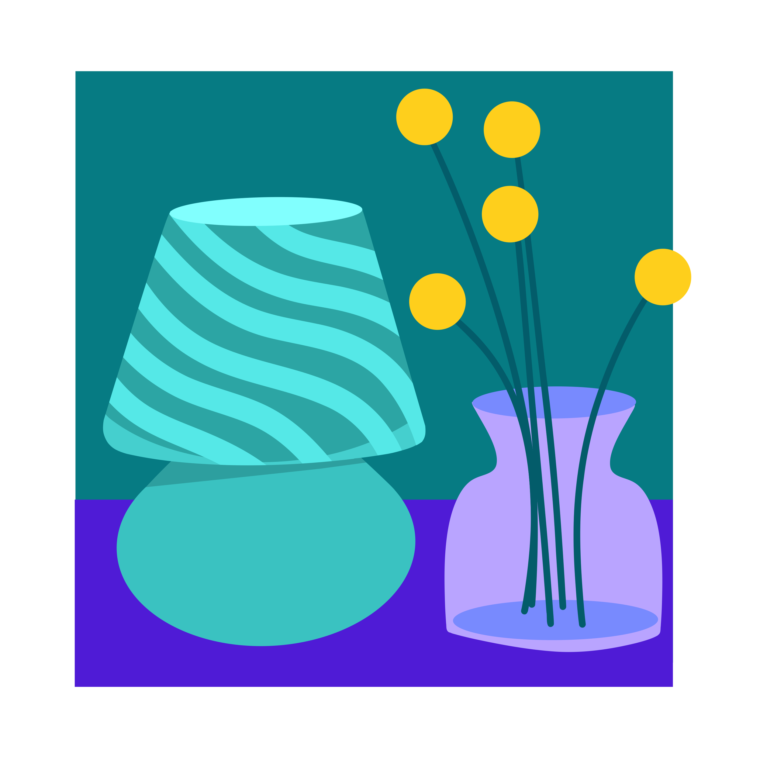 Funky still life illustration of a table with a lamp and a vase with yellow flowers.