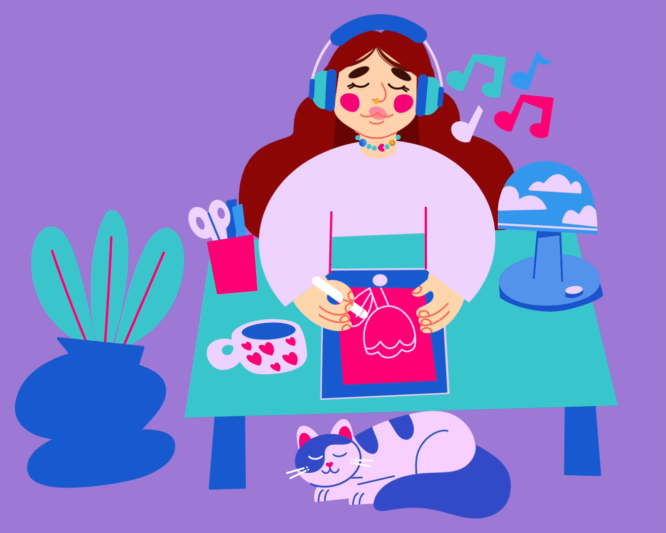 Illustration of a woman sitting at a desk with art and craft supplies, listening to music with headphones, and a cat lying beneath the desk sleeping.