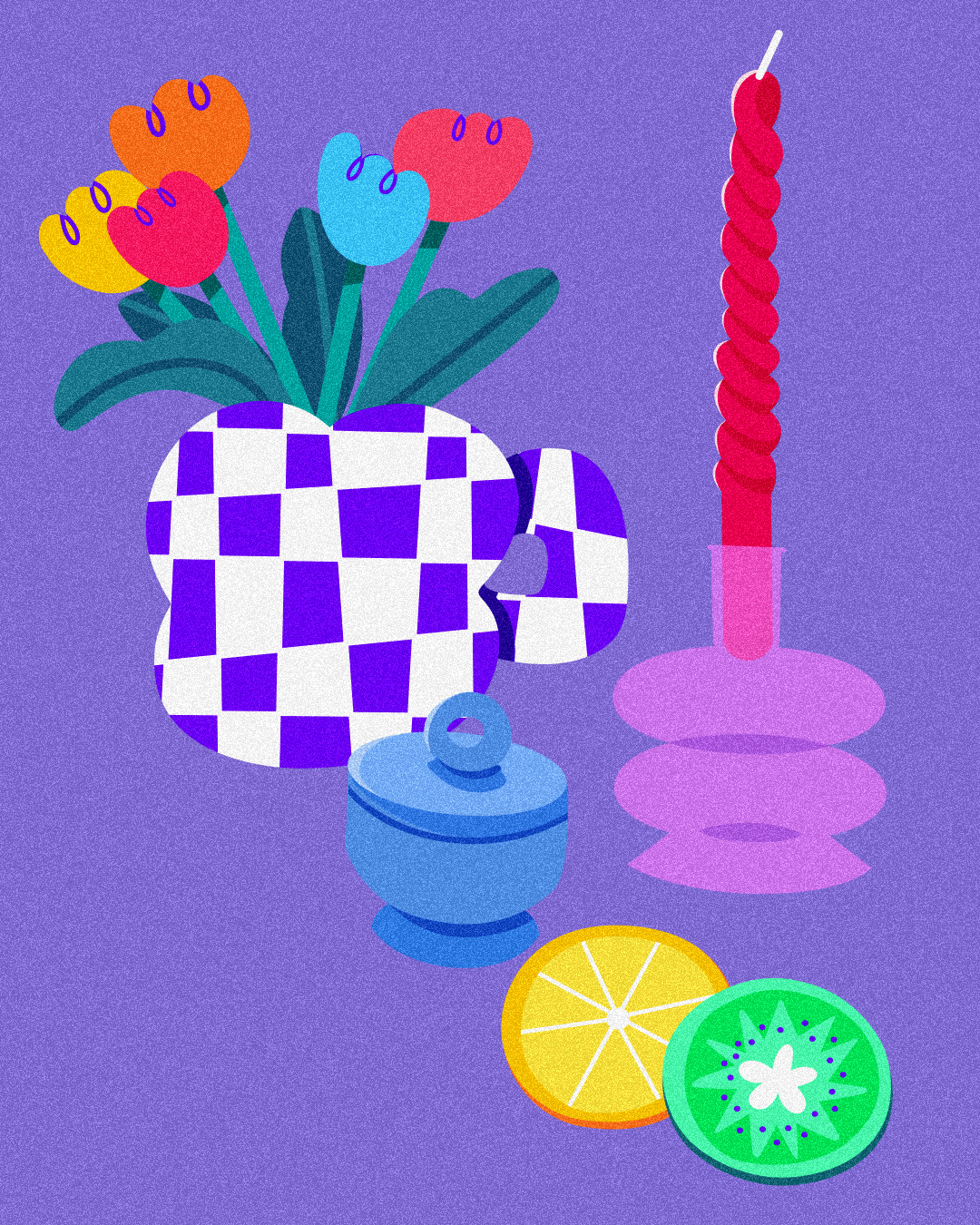 Colorful illustration of a mugt with a flower arrangement, a candle, a blue sugar bowl, and a lemon and kiwi designed coaster on a purple background.
